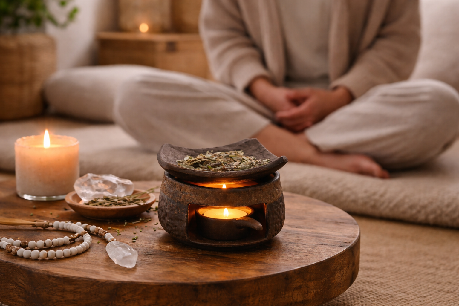 A ceramic herbal warmer inspired by traditional forms and natural textures, crafted to gently release the scent of dried herbs through warmth.